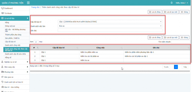 - Bước 2: Chọn công việc ứng với cấp độ bảo trì. Màn hình này cũng lấy danh sách các công việc thuộc cấp độ tương ứng (Nếu có).