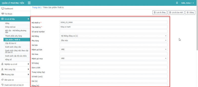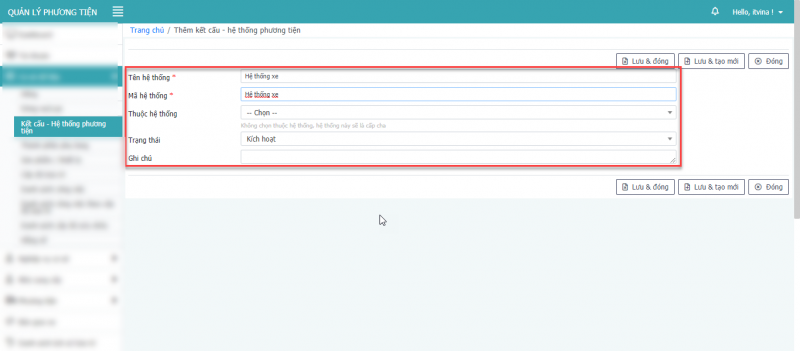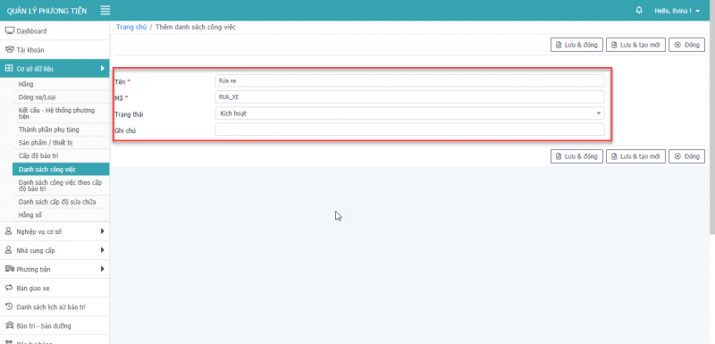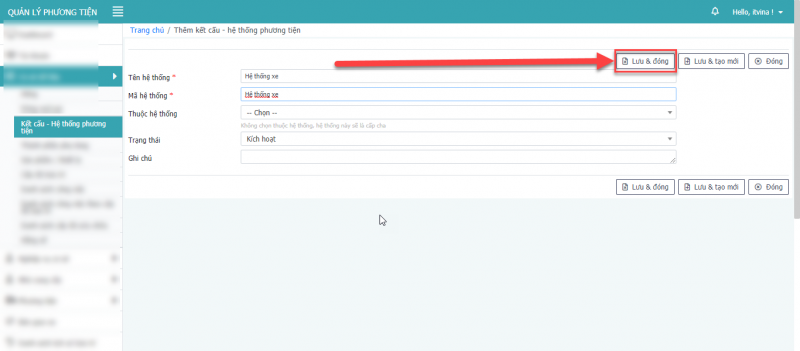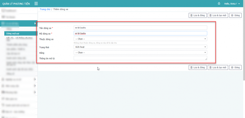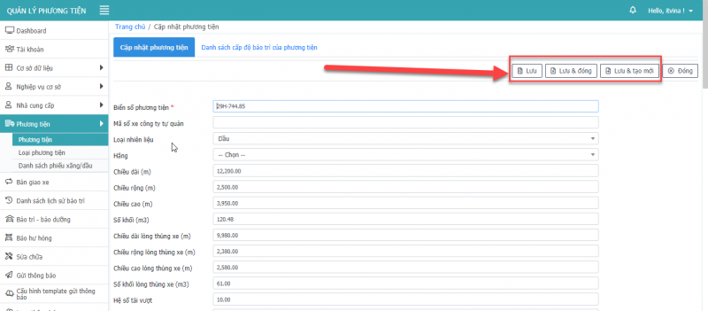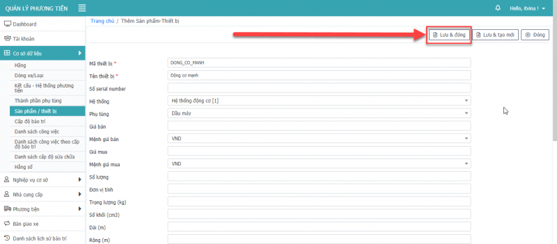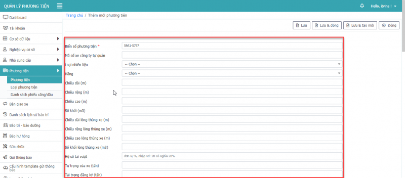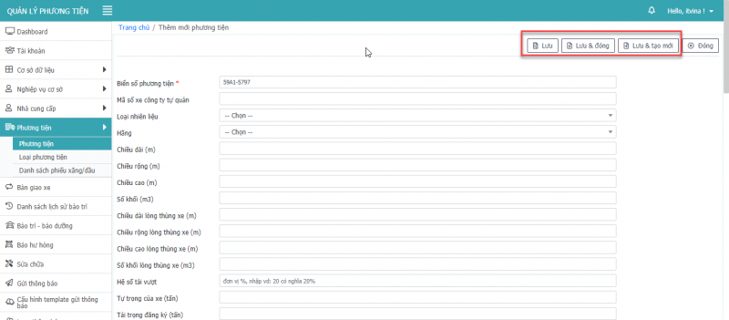 - Bước 5: Nhấn Lưu, hoặc Lưu & Đóng hay Lưu & tạo mới để thêm phương tiện.