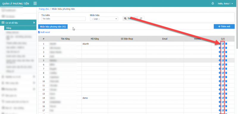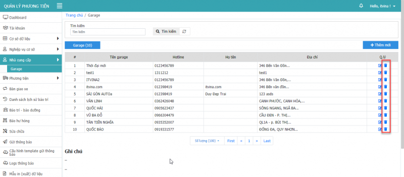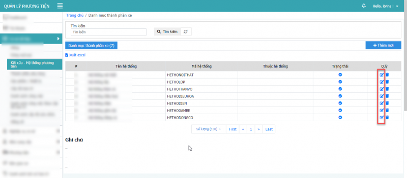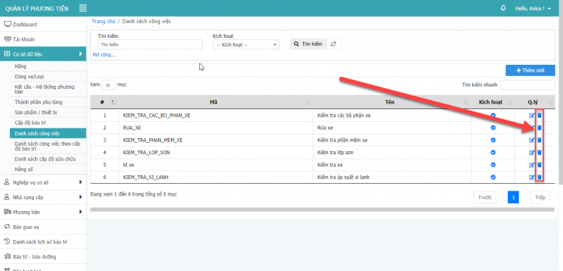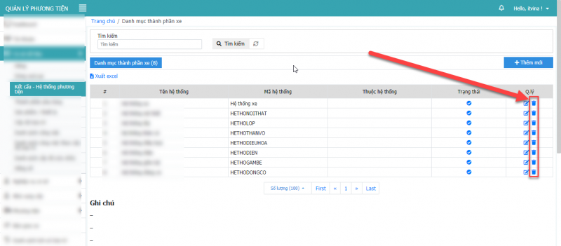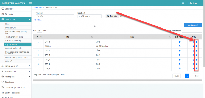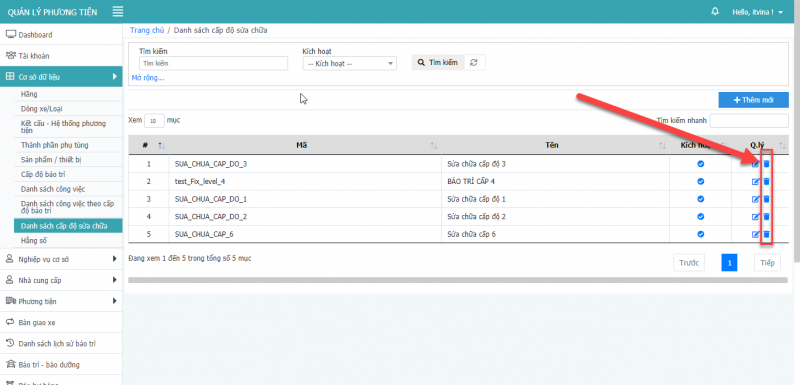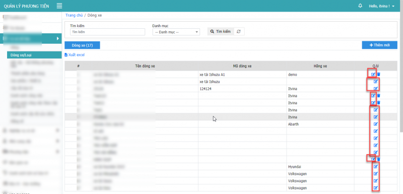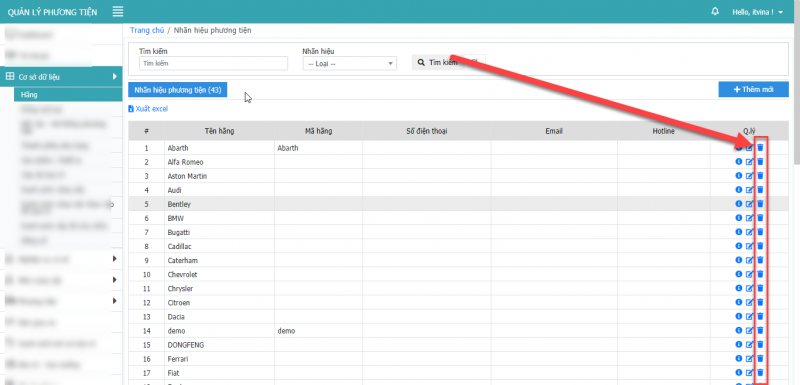 **Lưu ý: Chỉ xóa được xóa được các dòng xe là cấp con, không xóa được dòng xe cấp cha.