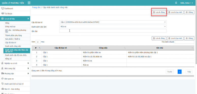 - Bước 5: Nhấn Lưu và Đóng để hoàn tất thêm mới công việc theo cấp độ bảo trì.