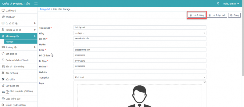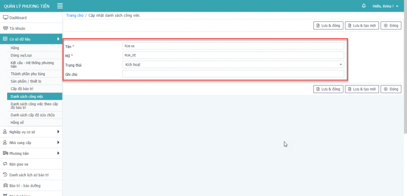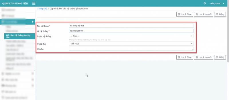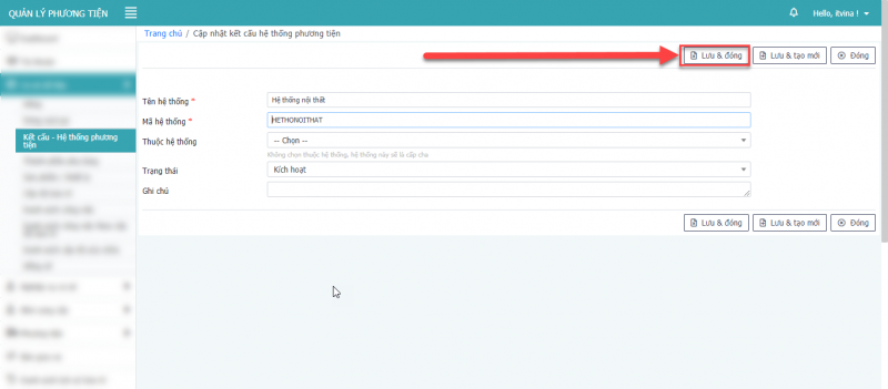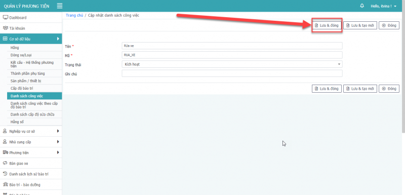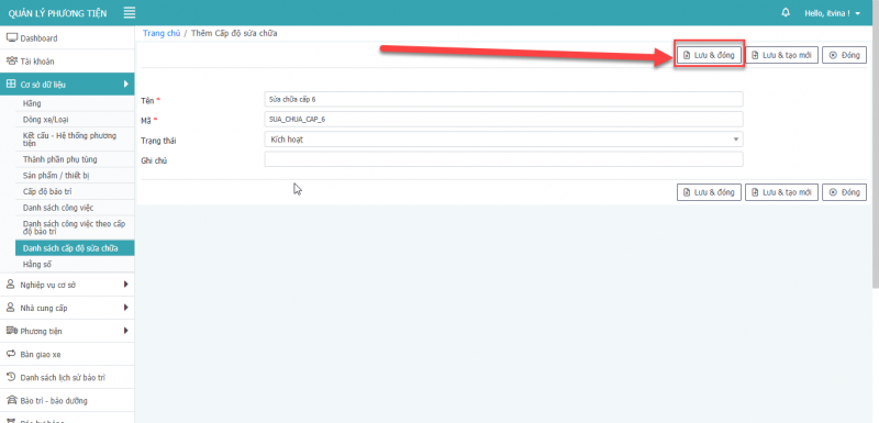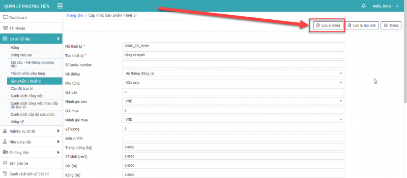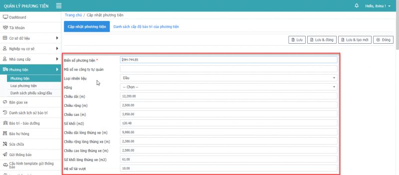 - Bước 3: Nhấn Lưu, Lưu & Đóng, Lưu & tạo mới để hoàn tất cập nhật phương tiện.