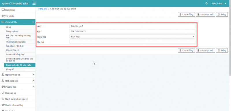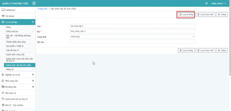 - Bước 3: Nhấn Lưu & Đóng để cập nhật thông tin cấp độ sửa chữa