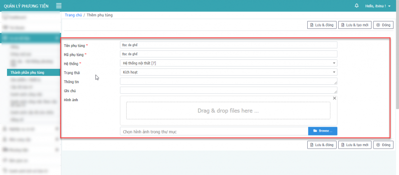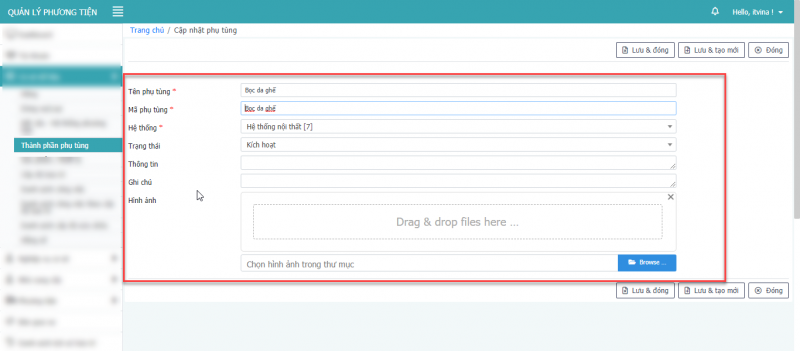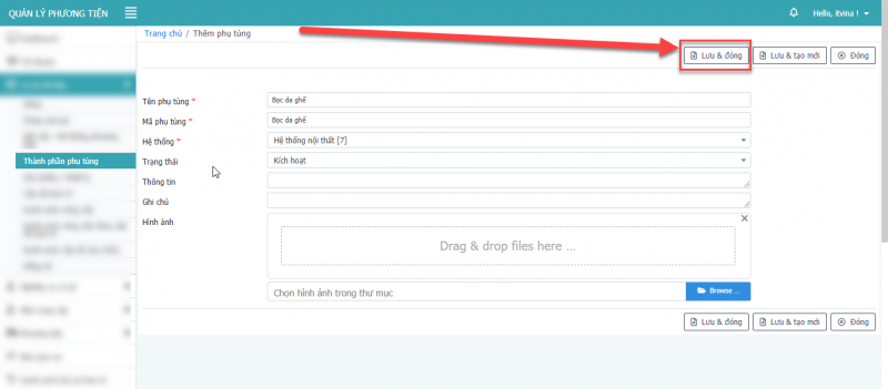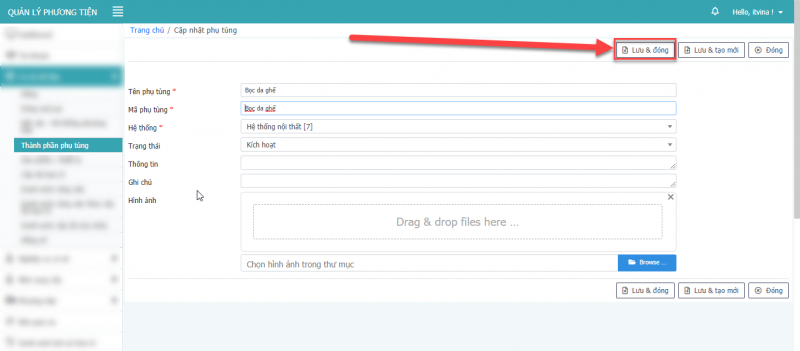 - Bước 3: Nhấn Lưu & đóng để cập nhật phụ tùng.