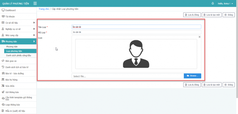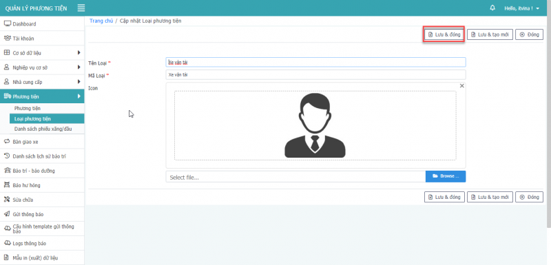 - Bước 3: Nhấn Lưu & Đóng để hoàn tất cập nhật loại phương tiện.