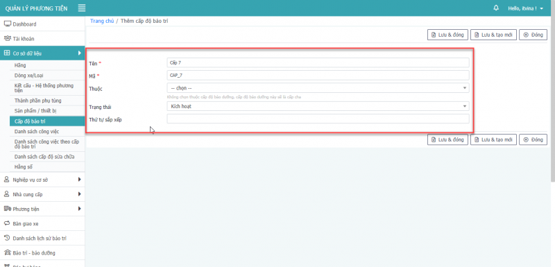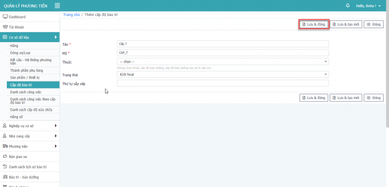 - Bước 5: Nhấn Lưu & Đóng để thêm mới cấp độ bảo trì.