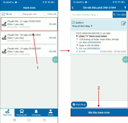 Tài xế chọn tin và nhấn “Bắt đầu hành trình”