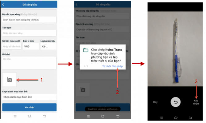 Hướng dẫn chụp ảnh: Nhấn biểu tượng chụp ảnh -> Nhấn “Cho phép” App can thiệp vào chức năng chụp ảnh của điện thoại -> Sau đó thực hiện chụp hình và nhấn “Xác nhận”: