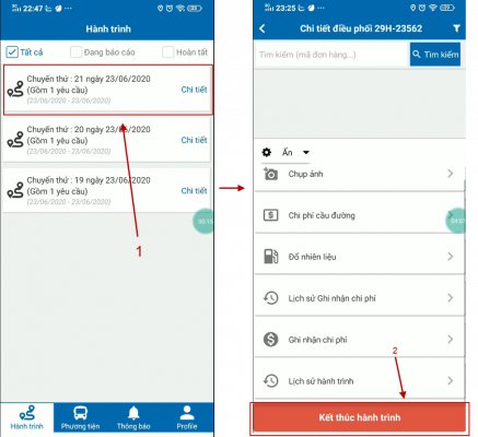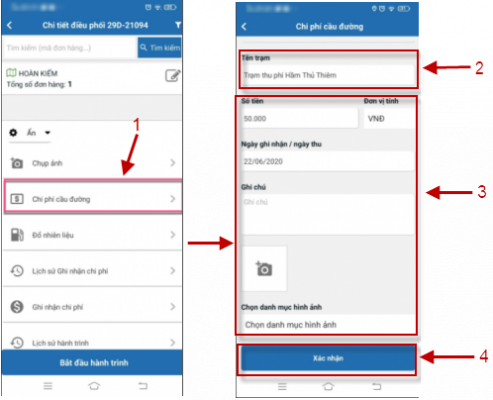 Tài xế nhấn vào “chi phí cầu đường” -> Chọn trạm thu phí -> Nhập số tiền, Chụp ảnh vé cầu đường -> Chọn thư mục lưu ảnh -> nhấn “Xác nhận” để lưu.