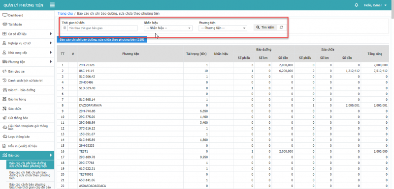 Ý nghĩa của báo cáo: Dùng để xem các chi phí bảo dưỡng sửa chữa theo phương tiện.