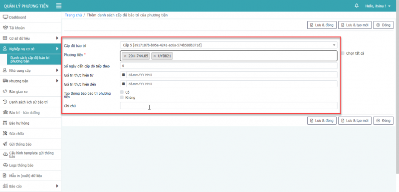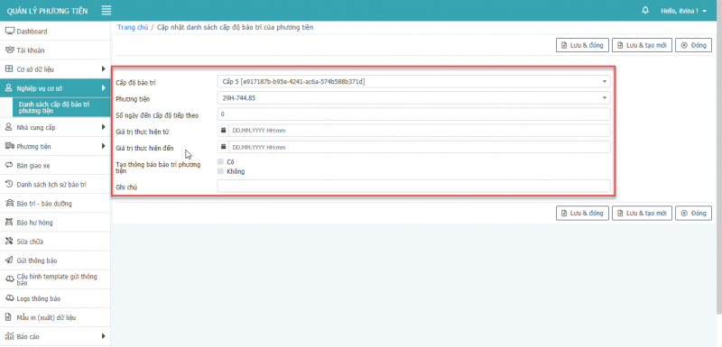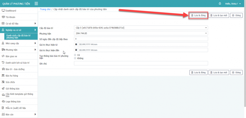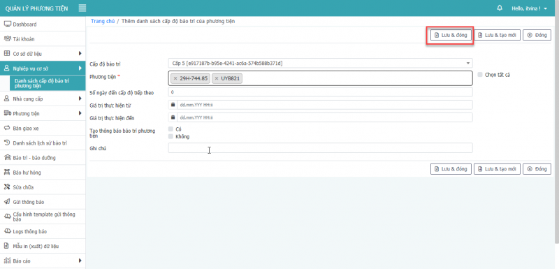 - Bước 3: Nhấn Lưu và Đóng để cập nhật danh sách cấp độ bảo trì của phương tiện.