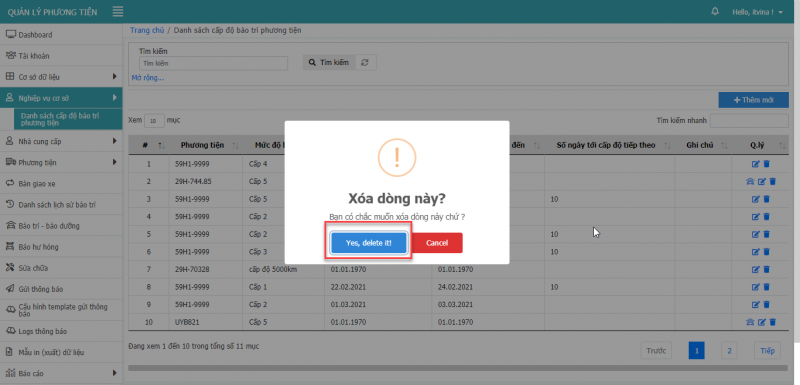 1.3 Xóa cấp độ bảo trì phương tiện