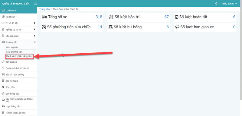 - Bước 2: Chọn danh sách phiếu xăng/dầu