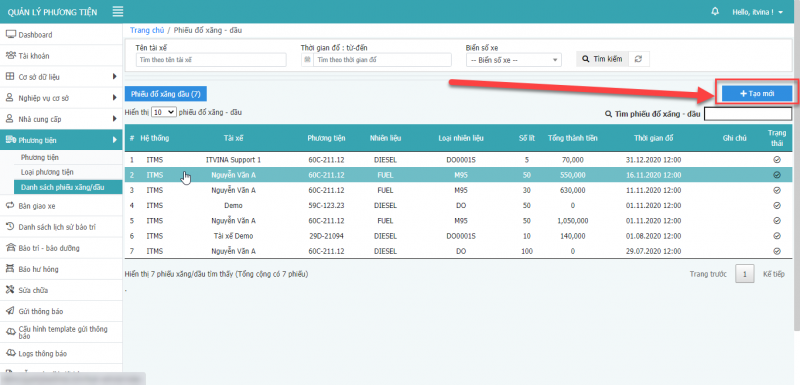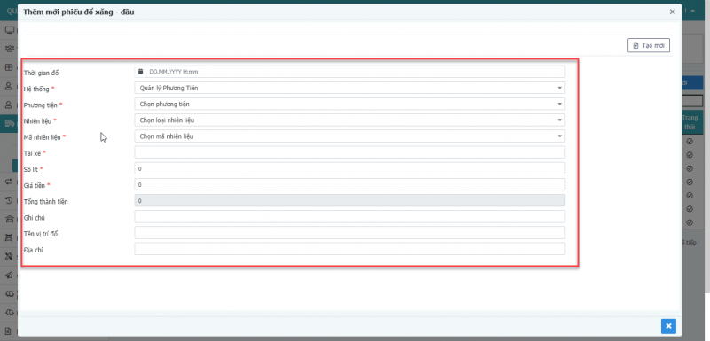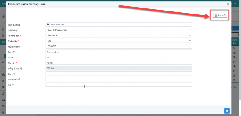 - Bước 5: Chọn tạo mới để thêm mới phiếu đổ xăng – dầu.