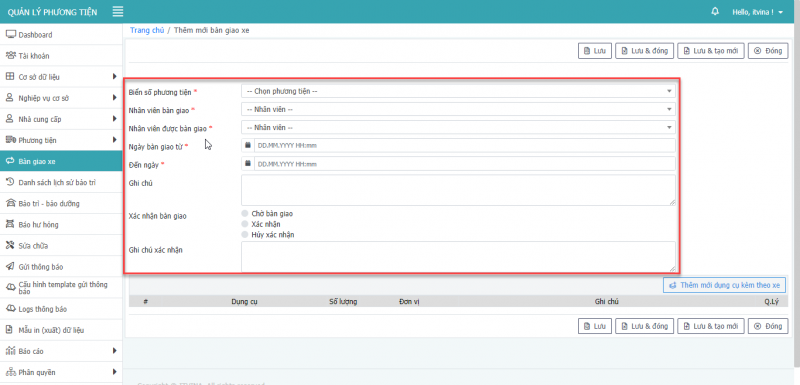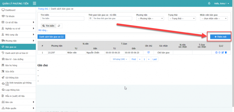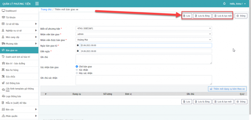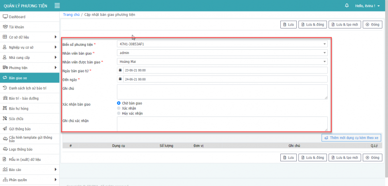 - Bước 3: Nhấn Lưu để cập nhật bàn giao phương tiện.
