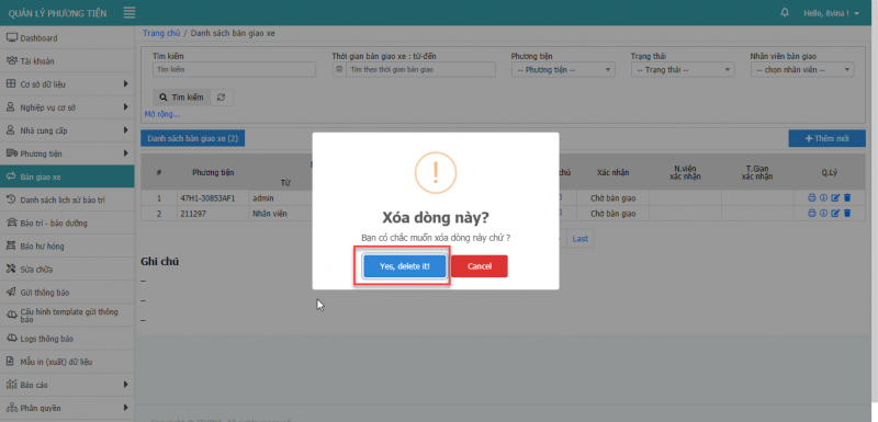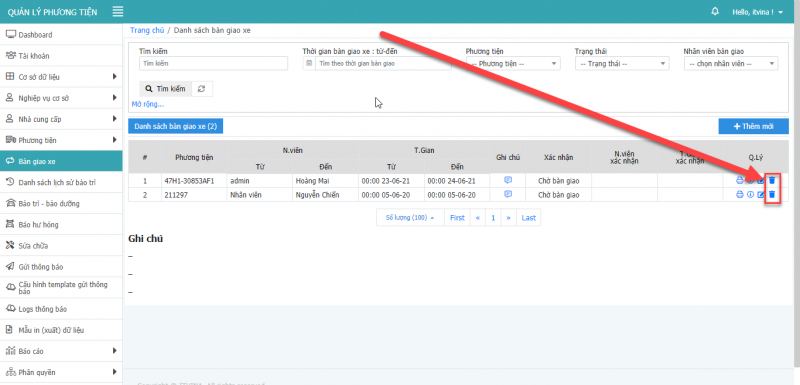 3.3 Xóa bàn giao xe: