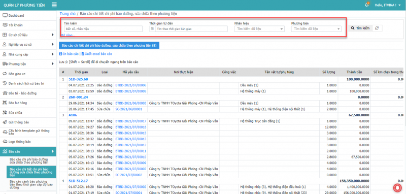 - Bước 2: Chọn báo cáo chi tiết chi phí bảo dưỡng sửa chữa theo phương tiện.