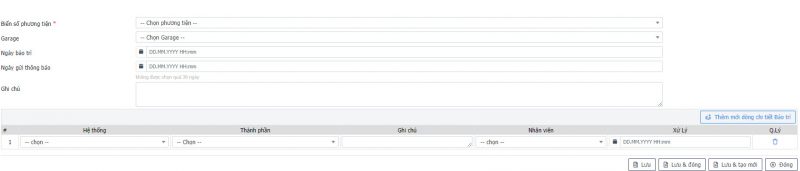 Điền thông tin phiếu-> thêm các mục cần bảo trì “Thêm mới dòng chi tiết bảo trì” -> Chọn và điền thông tin bảo trì -> Nhấn “Lưu”