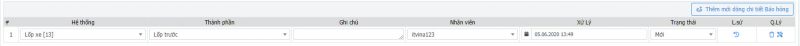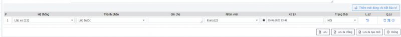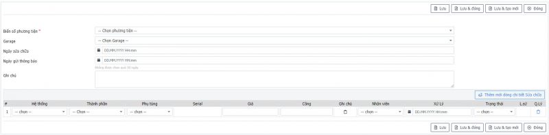 Điền thông tin phiếu-> thêm các mục cần sửa chữa “Thêm mới dòng chi tiết sửa chữa” -> Chọn và điền thông tin bảo trì -> Nhấn “Lưu”