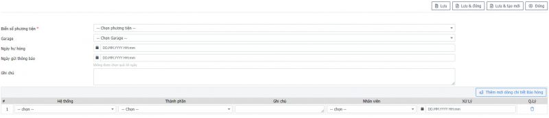Điền thông tin phiếu-> thêm các mục cần báo hỏng “Thêm mới dòng chi tiết báo hỏng” -> Chọn và điền thông tin bảo trì -> Nhấn “Lưu”